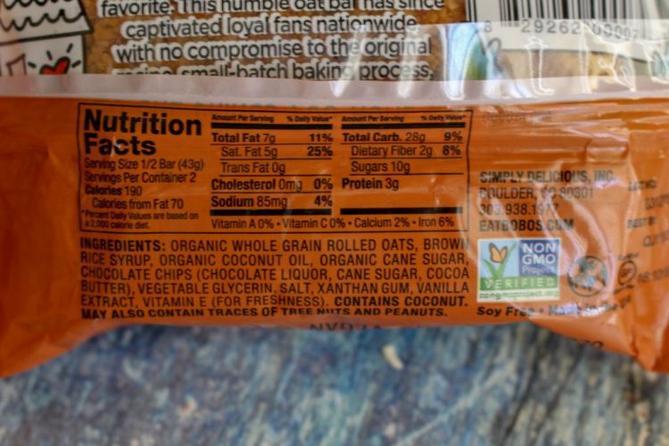 In half an Chocolate Chip Bobo’s Oat Bar there are 190 calories (380 calories in the whole bar) with only 70 of those fat calories (most of the calories are coming from the first ingredient: oats). There are seven grams of fat with five grams of saturated fat from the coconut oil. Bobo’s Oat Bar is vegan so it does not contain cholesterol (only animal based products contain cholesterol). The gluten free vegan oat bar only has 85 milligrams of sodium in half the bar (170 mg in the entire bar).